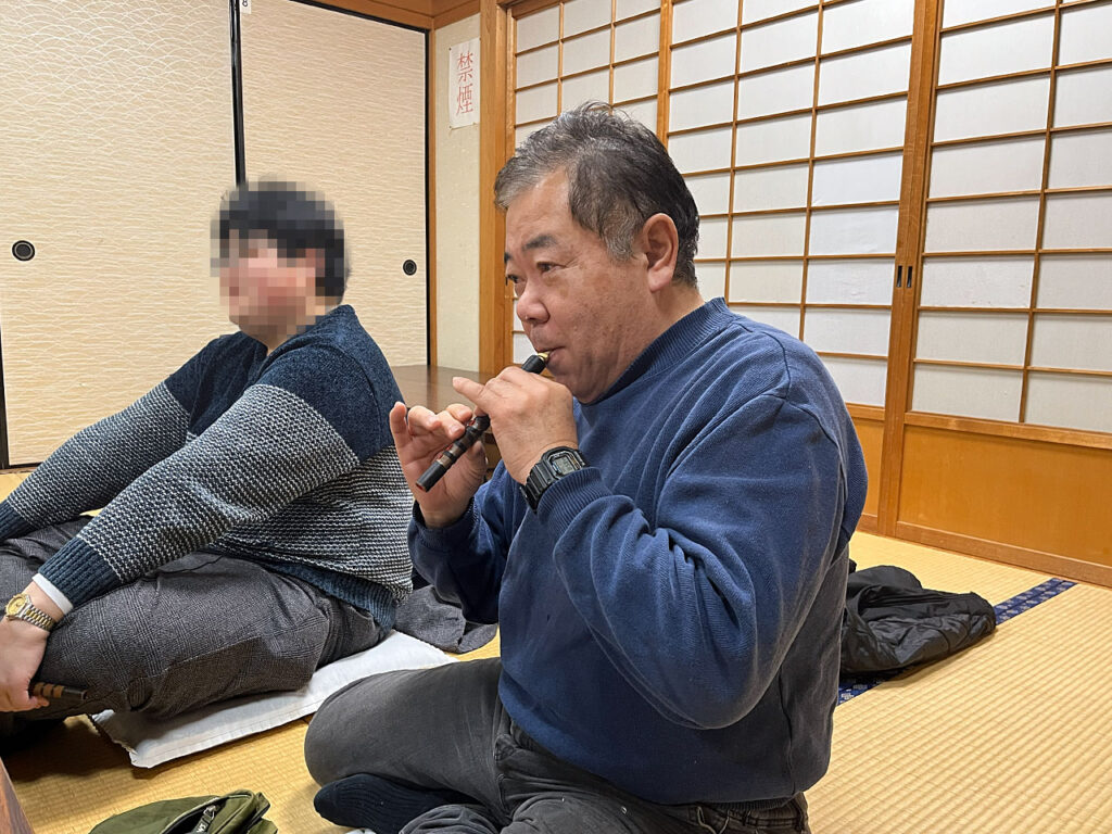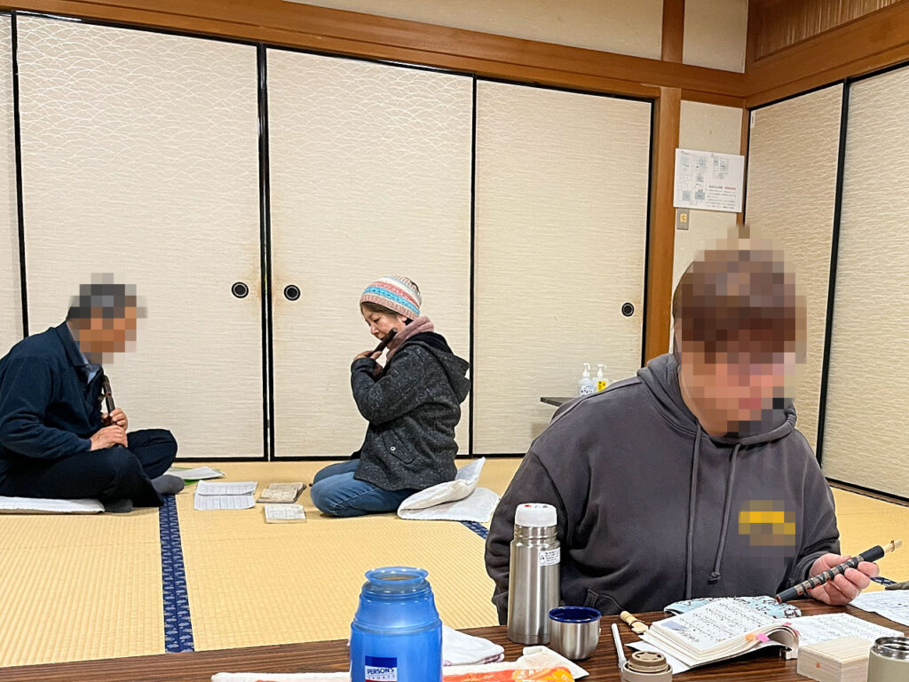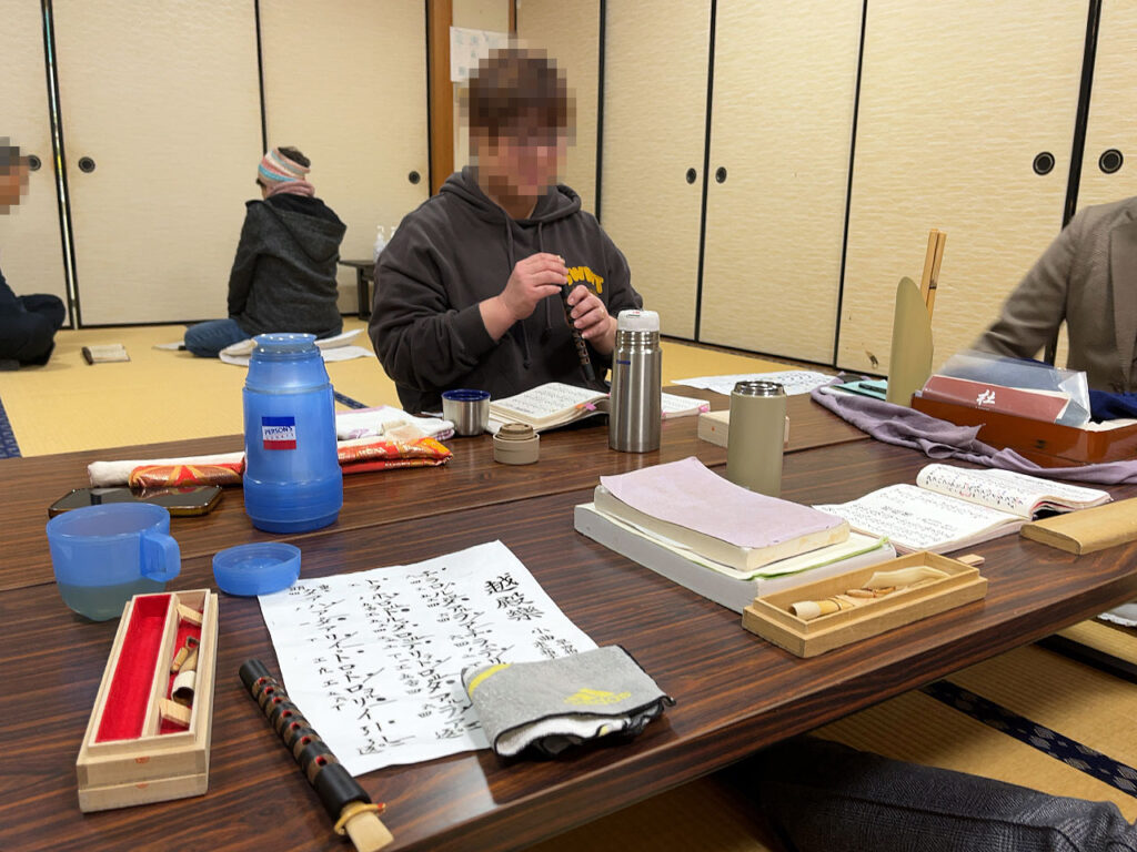 夜7時半からは大阪より先生にお越しいただき、日野町立東桜谷公民館にて日野雅楽会の練習を行いました。